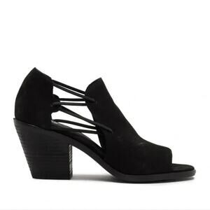 Eileen Fisher nubuck leather bootie. 2.5" stacked block heel. Open toe. d'Orsay silhouette. Side stretch insets. Padded footbed. Leather and rubber sole