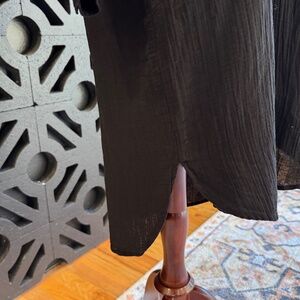 Chic, minimalist Eileen Fisher long tunic in a versatile black. Crafted from 100% organic cotton, this piece features a lightweight crinkled texture that offers effortless drape and comfort. Designed with a button-front closure, long sleeves, and a relaxed straight silhouette. Wear it as a dress, layered as a tunic over leggings, or open as a lightweight duster — a true capsule-wardrobe essential.
