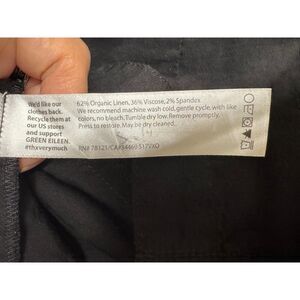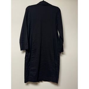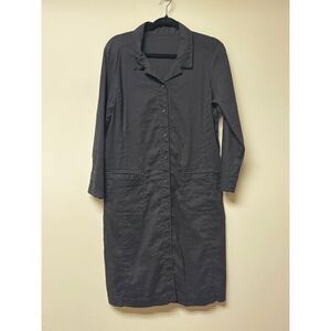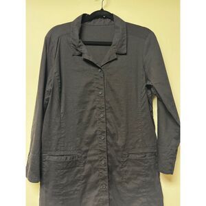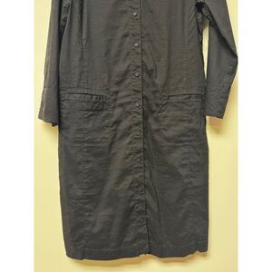 Black organic linen blend chore/shirt dress with front pockets and collar. Long sleeves with a little stretch for comfort. 62% organic linen, 36% viscose and 2% spandex. Label and size are missing but materials tag is attached. According to Eileen Fisher size chart, this is a size large but would likely fit a size M-L. Please check measurements below.