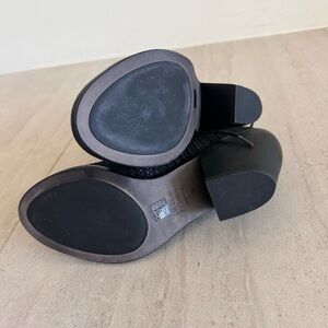 EILEEN FISHER Peep Booties Sandal. Black Leather Lace Up Heels. Size 9 - fits true to size. Very comfortable heel, about 2.5” H. Color black. Gently worn only one time - great condition! Not in original box.