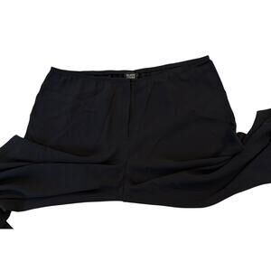 Black. Front zipper, button and slide button closure. Wider, straight leg. Full length. Elastic waistband with a slight amount of stretch. High rise. 100% silk -crepe type.