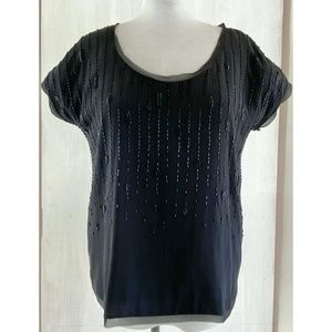 Gorgeous Women's Size Large Fully Lined in Silk Beaded Black Silk Short Sleeve Round Neck Pullover Top by EILEEN FISHER - Fabulous silk blouse for the Holiday Season