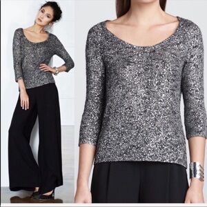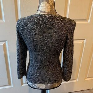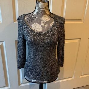 EILEEN FISHER PETITES. Preloved in excellent condition. Silver metallic knit scoop neck sweater with 3/4 sleeves