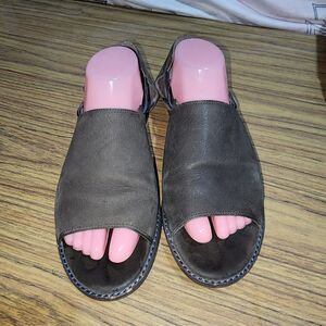 EILEEN FISHER Sz10 Taupe Gray Leather Open Toe Elastic Strap Sides Flats Sandals