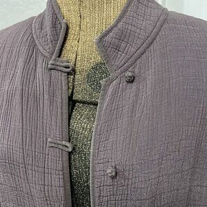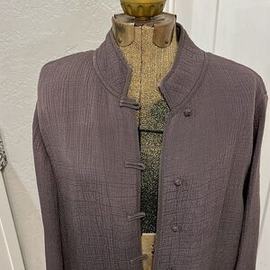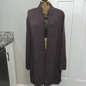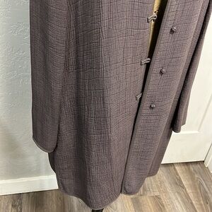 Gorgeous, dark charcoal, gray/purple? crinkly, almost scuba fabric so small rayon silk, blend Eileen Fisher brand tunic with buttons at the front. Please look at all pictures and comment below with any questions.. very slight discoloration on a call or a senior pictures