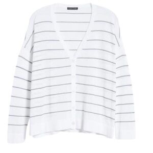 Details: Eileen Fisher white and black striped lightweight v-neck tencel and nylon blend relaxed fit cardigan