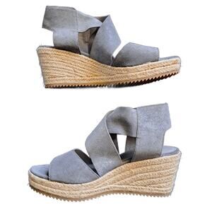 EILEEN FISHER Willow Wedge Sandals Size 8 Pewter Metallic Suede Jute Espadrille