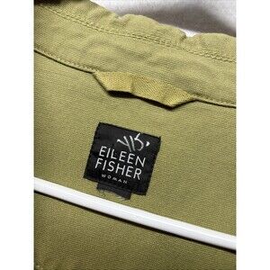 The product is an EILEEN FISHER Women Organic Cotton Button-Up Olive Green Blazer Jacket in size 2X. It is a short-length jacket with 3/4 sleeves and a button closure. The jacket features a solid green color, collared neckline, and pockets. The blazer is made of a cotton blend material with organic and stretchy features, suitable for all seasons. The design of the jacket combines classic and city-themed elements, making it a versatile and stylish addition to any woman's wardrobe.