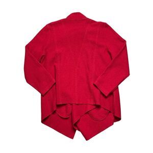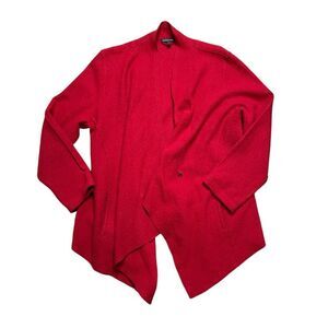 This Eileen Fisher cardigan sweater in a vibrant red hue features an open-front style with a chic asymmetrical design. Crafted from a soft knit material, it offers a luxurious feel and a slight sheen, making it a standout piece in any wardrobe.