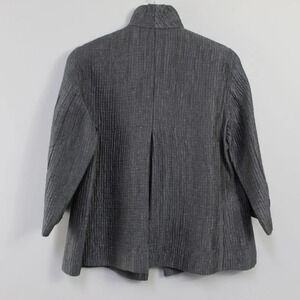 EILEEN FISHER gray crinkle silk minimalist blazer unlined size small in excellent Pre-owned condition. Modern back side pleat,side pockets and quarter length sleeves.