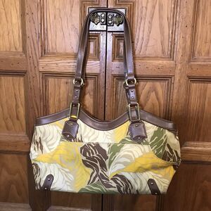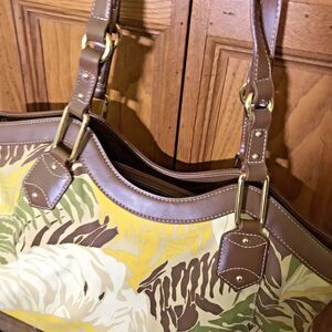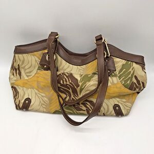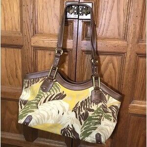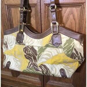 EITENNE AIGNER Sayville Collection, Hobo Tote. Tropical Palm Leaves, Brown, Yellow, Green, Cream, Cotton Canvas Purse. This bag has never been used, just stored. No tags. Great for an Island Vacation!