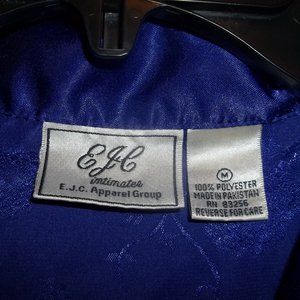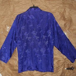 This is a purple two piece silky set, with long sleeves and covered buttons. There is an embossed design on the top and on the bottom the pants are plain.