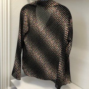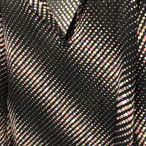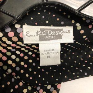 Top is 100% polyester and is a light, flowy fabric (slightly sheer). It’s black with pastel colored polka dots in varying sizes. Top is has a collar and V neck but no buttons—it’s a pull over style. Sleeves are long and are bell shaped (about 16” in circumference at the ends of sleeves) and asymmetrical at the ends. This is a size petite large and measures 22” from armpit to armpit and is 25” in length. Pristine condition.