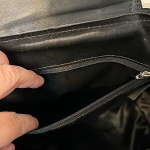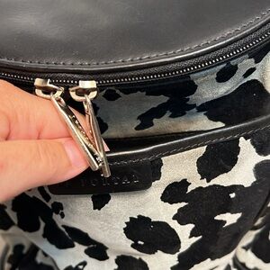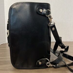 El Portal brand leather backpack. Some minor staining and scuffing to leather. Please look at all pics and measurements in video and comment below with any questions. Made in USA. Black and light blue ish colored?