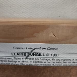Please note, scuffs to frame this beautiful artwork reproduction by Elaine Dungill features an African child girl with a vase, beautifully captured through the use of lithograph and giclée print techniques. The piece is framed and signed by the artist, making it a perfect addition to any art collection.