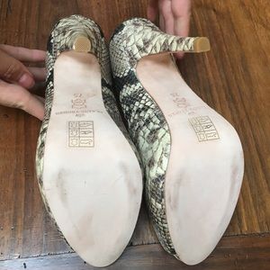 Gorgeous crocodile print shoe. Worn once. Extremely comfortable. Black and cream colors. 4 1/2 inch heel