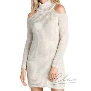 Elan Beige Tan Turtleneck Cold Shoulder Sweater Dress Tunic Small