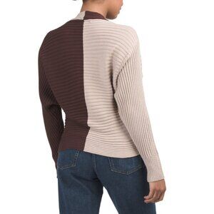 ribbed knit construction, color block design, soft and comfortable, faux wrap front