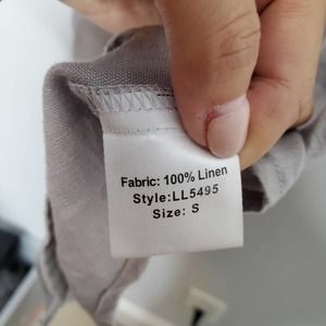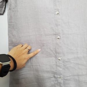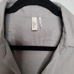 CONDITION pre-owned condition: Elan Short Sleeve Button Front Collared Mini Shirt Dress in Grey. Short sleeves, shirt collar neckline, front button closure. Shirttail hemline, mini length. 100% Linen. Style LL5495.