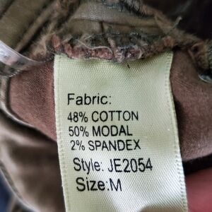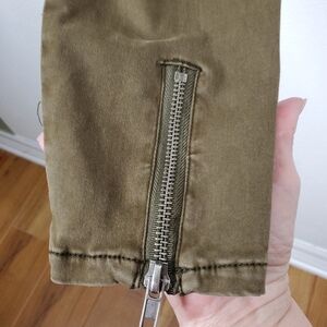 Faux pockets in front, two back pockets, zippers at ankles, ruched or padded at knees, pant.