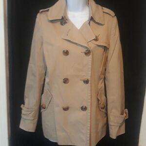 This is a gorgeous coat by E LAND. Size translates to small. This coat is gorgeous with the tortoise shell buttons. Lining is beautiful plaid. Nice tan color to go with anything. Has 2 front pockets. Lapel collar that can be brought up around neck. This is a very high end company from South Korea. Coat is made extremely well. In fantastic condition!!