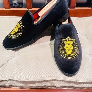 ELANROMAN Men's Lion Crest Velvet Loafers are the ones for you. You want to lounge in style, you want to ware and have a high class symbol of casual life style well it’s all here. These shoes is the way to go with a health quitted cushioned insole goes well with most casual outfits. Excellent Condition. Beautiful Shoes. L4