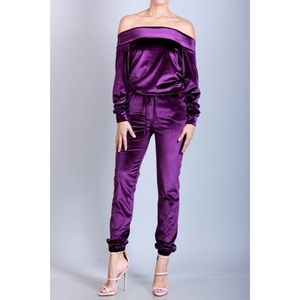 OFF THE SHOULDER VELVET JUMPSUIT