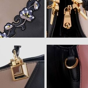 This sophisticated satchel showcases a striking black and gray two-tone design, enhanced by delicate floral embroidery. Crafted with a structured silhouette, it features gold-tone hardware and a detachable shoulder strap for versatile styling. Details in Gallery.