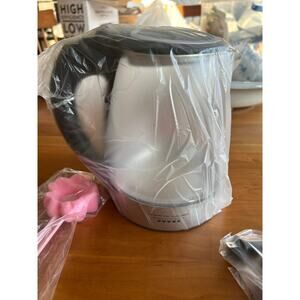 The "ELECTRIC GLASS KETTLE" is a small kitchen appliance designed for making tea or boiling water. It is compatible with electric stoves and has a power source that is also electric. The kettle has a capacity of 12 cups, making it suitable for preparing multiple servings at once. The sleek black color and glass material give it a modern and stylish look that would complement any kitchen decor. This kettle is a convenient and efficient option for quickly heating water for hot beverages or cooking needs. This is in the box brand new. It is mint.