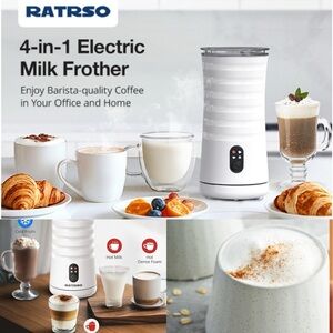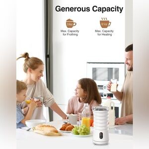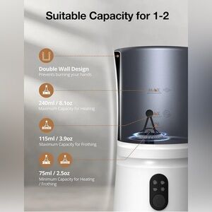 Introducing the Electric Milk Frother with Two Whisks - the perfect 4-in-1 multifunctional tool for achieving delicious and professional-quality coffee beverages at home. With this milk frother, you can easily create rich and creamy froth in just a few minutes, perfect for lattes, hot chocolates, cappuccinos, and more.This electric coffee frother offers four different functions, allowing you to customize your drinks. With the ability to produce hot dense foam, hot airy foam, hot milk, and cold froth, you can achieve barista-level froth for your favorite coffee beverages.Boasting a maximum capacity of 240ml/8.1oz for heating milk and 115ml/3.9oz for frothing, this milk frother can make enough for multiple drinks at a time Whether you want a delicious latte or a frothy cappuccino,this frother can handle it with ease.Cleaning up after use is a breeze with the scratch-resistant and non-stick coating interior of this milk frother. It allows for easy maintenance and hygienic cleaning, ensuring your frother stays in top condition.Your safety is our top priority, which is why this milk frother has ETL certification and Strix temperature control. It automatically switches off when your milk or froth is ready, preventing it from burning or over-frothing.Invest in the Electric Milk Frother with Two Whisks to elevate your at-home coffee game and enjoy professional quality froth in every cup. Order now and experience the convenience and deliciousness of this multifunctional milk frother.