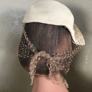 This is a delightful small toque from the 1950s'. A toque is small cap or bonnet having a narrow brim or no brim at all. Toques were popular from the 13th to the 16th. Century in Europe, especially in France. The toque is made. of. very fine cream colored straw, and it is supposed to sit on top of the head, The asymmetrical style has flexible 'edges at each side, which are supposed to keep the hat in place. The upturned narrow "brim" at the front is trimmed with a beautiful pattern of white beads. There is a coordinating beige color veil, which can be worn over the face, tying it at the back, or placed top.