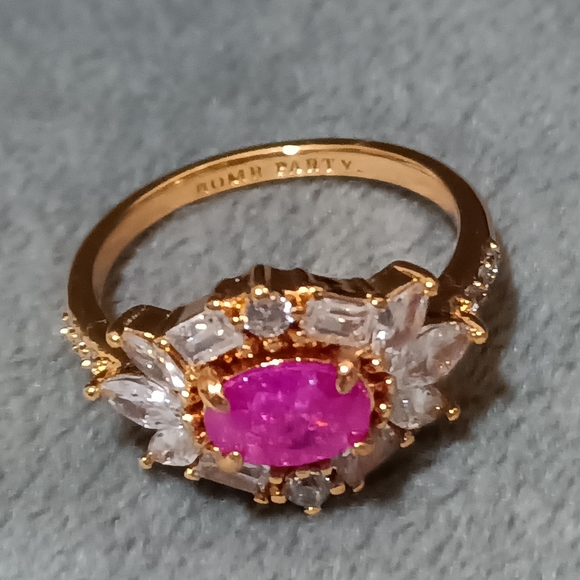 🪄 This stunning ring features a vibrant pink centerpiece surrounded by sparkling stones, set in a luxurious gold color band. Perfect for adding a touch of elegance to any outfit.