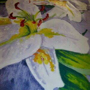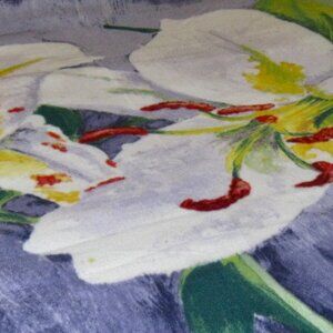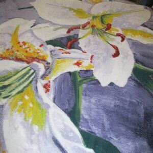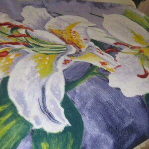 "THIS VERY PRETTY FLORAL DESIGN LAP BLANKET IS BEAUTIFUL!" The colors are stunning with purples, greens, yellows and red! To me the flowers look like orchids or lilies and the color combination is exquisite. This has never been used and will ship to the buyer in a poly bag and shipping envelope. It Measures 77" x 60" and as the label states, it is hand washable and light iron if needed. It says it was made in China and we are in awe of the floral design. Need some extra warmth through the Fall months? This will be a wonderful and colorful addition to your home. Any questions, please contact the seller. P.S. This blanket is shown on a Queen size bed.