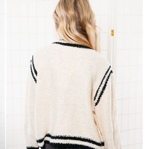 From NEUTRAL GROUND!! Elegant cream and black tie front cardigan. Soft, exceptional quality. NEUTRAL GROUND offers high end , top notch items!! Size L. LIKE NEW!!!!