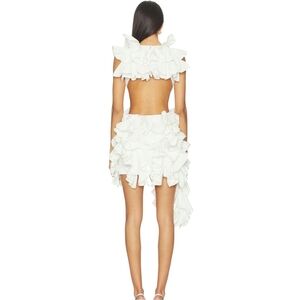 This ruffle-forward stunner is pure statement energy. Crafted from a smooth, stretchy knit base, this mini dress features a plunging neckline, sleeveless silhouette, and a beautifully textured ruffled bodice that feels equal parts soft and sculptural. The open back adds a touch of allure, while cascading ruffles flow down the hem for that dreamy, high-fashion movement. Finished with raw-edge distressed detailing and a sleek zip-up back closure, this piece is drama in motion. Style it with lace-up heels and a chic clutch for a look that feels runway-ready, romantic, and effortlessly bold. ✨🕊️