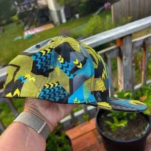 Vintage 1990s Element Crowns Skateboard baseball cap in like-new condition. Abstract & geometrical blue, yellow & black design. No rips, tears or stains