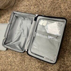 Great carry-on bag. Front compartment for laptop. Comes with tech bag for cables and chargers. Navy.