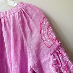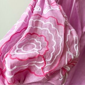 Beautiful pink linen dress from ELEVEN March 11. Features puffed sleeves with floral embroidery, white tassel ties, snap up front, two side pockets, split v neckline, dropped waist, pleated skirt.