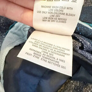 Flat front wide leg dress pants in gray tweed with blue tweed color blocking at waist and sides. Belt loops, unlined.