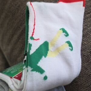 Fun holiday socks 'Raised by Elves' design. Gray base with red and green accents. Perfect for festive occasions. Brand new. 2 pair total.