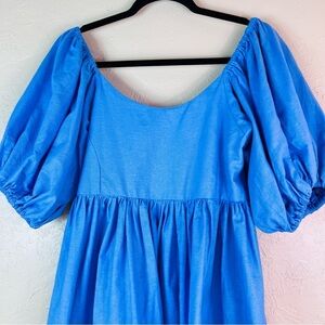 ELF Linen Handmade Puff Sleeve Blue Smocked Milkmaid Dress SIZE LARGE