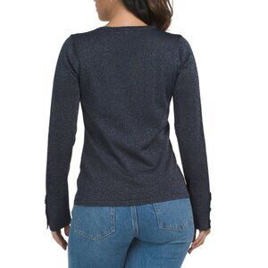 ELIE TAHARI DARK NAVY Long Sleeve Crew Neck Metallic Sweater With Button Cuffs