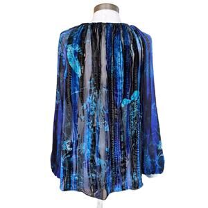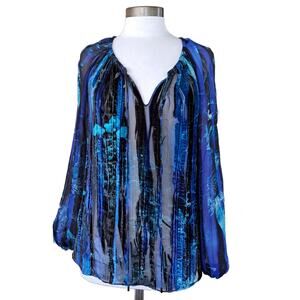 ELIE TAHARI Luxe Burnout Velvet Silk Peasant Blouse Medium Top Blue Black