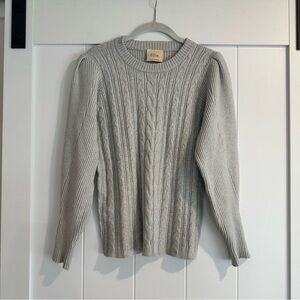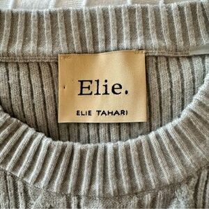 Gently used Elie Tahari sweater. Grey with cable knit detailing. Very small flaw - black mark on one arm but barely noticeable. Size tag cut off - measurements will be added.