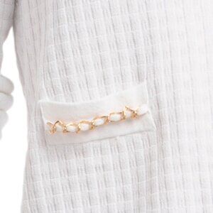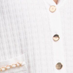 ribbed trim and cuffs, gold tone accents, button front closure