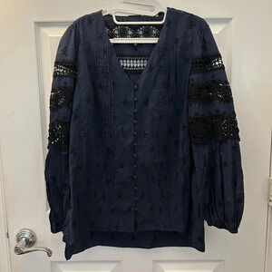 In perfect condition Elie Tahari "Leigha" cotton blouse with lace insets and embroidered details. V-neckline; button front. Long poet sleeves