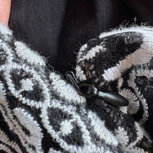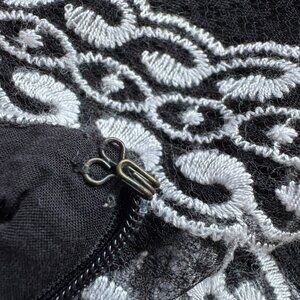 The ELINE Black White Embroidered Lace Evening Party Maxi Dress in size Small is a stylish and elegant choice for various occasions such as weddings, parties, or formal events. The dress features a V-neckline, sleeveless design, and a long length with an asymmetrical hem and a slight ruffle detail. The black and white floral lace embroidery adds a touch of sophistication, making it a perfect choice for a witchy, evening wear, or a gypsy-inspired look. Hand wash only, this dress is a statement piece that exudes a mix of boho and gothic aesthetics. Adjustable straps; rayon lining.