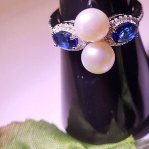 ELITE, New, JEWELRY, SIZE 7, .925 STERLING SILVER, SAPPHIRE, 7MM FW PEARL RING