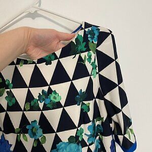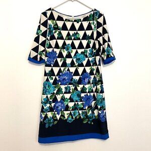 ELIZA J Blue Green Floral / White Black Geo Geometric Elbow Sleeve Shift Dress 6