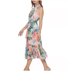 ELIZA J Dress 12 Midi Halter Floral Keyhole Button Neck Closure Ruffle Hem Lined